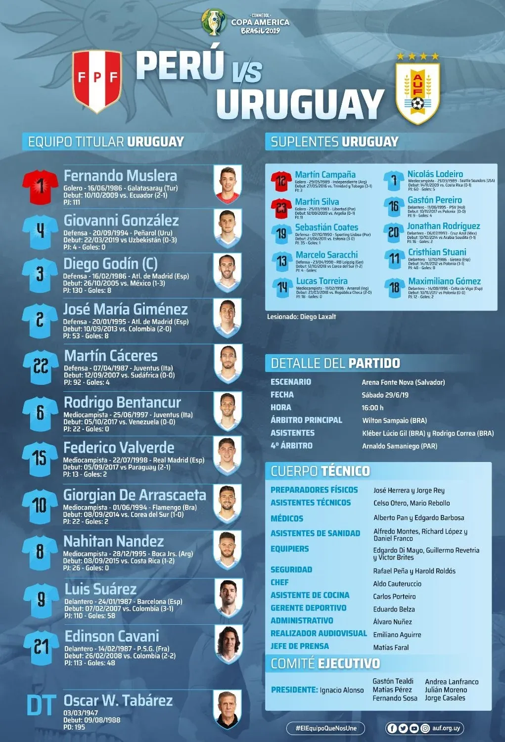 El once lo integraron Fernando Muslera; Giovanni González, José María Giménez, Diego Godín, Martín Cáceres; Federico Valverde, Rodrigo Bentancur; Nahitan Nández, Giorgian De Arrascaeta; Luis Suárez y Edinson Cavani.
