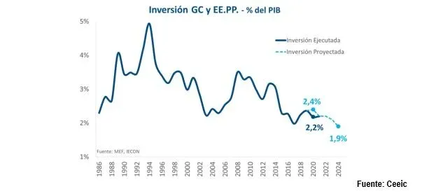 El gasto en inversión del sector público alcanzó 2,2% del PIB en 2020, similar al registro de 2002 y apenas por encima del registro de 2017 (1,9%). En los 12 meses cerrados a abril de 2021 el gasto en inversión del sector público consolidado alcanzó el 1,7% del PIB, según datos del Centro de Estudios Económicos de la Industria de la Construcción (Ceeic).