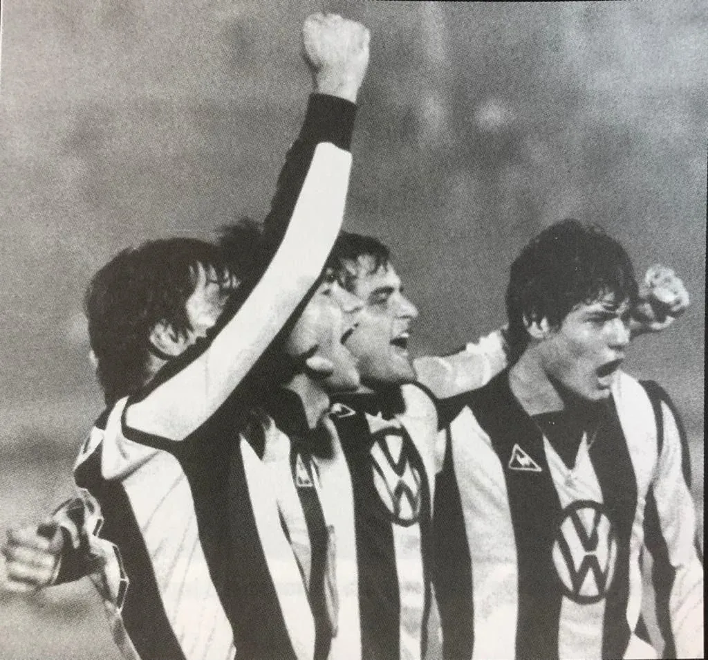 El momento del gol de Diego Aguirre en la final contra América de Cali en Santiago de Chile; Tito Goncalves no lo puede creer y se toma la cabeza y Marcelo Rotti corre para abrazarlo; detrás, Aponte se toma la cabeza, pero desde otro punto de vista