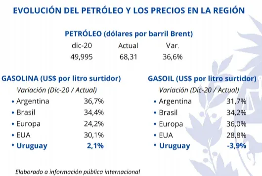 El gobierno destacó que la nafta tuvo en Uruguay una variación de 2,1% desde diciembre, frente al 30% registrado en Estados Unidos, 24% en Europa, 34% en Brasil y 37% en Argentina.