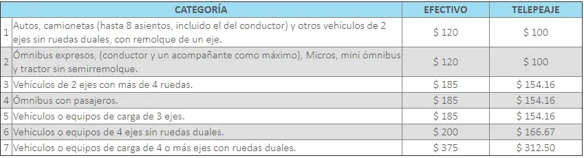 El ajuste quedó operativo desde junio y aplicó una suba de $ 5 para las distintas tarifas para pagos en efectivos. El peaje para para autos y camionetas, al igual que los ómnibus expresos, micros y camiones tractores sin semirremolque pasó a costar $ 120. En el caso de los vehículos de dos ejes con más de cuatro ruedas, ómnibus con pasajeros y vehículos o equipos de carga con tres ejes el valor es de $ 185, según el decreto. En tanto, los vehículos de carga pesados con más de cuatro ejes pasarán a pagar $ 375.