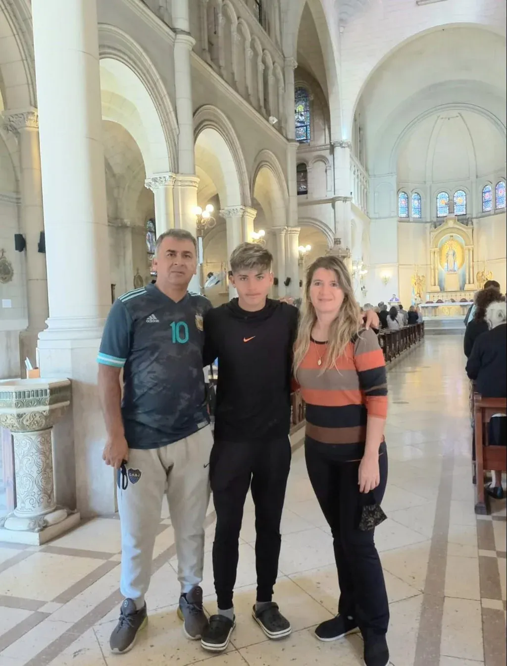 El misionero Antonio Vidal González junto a su hijo Ezequiel y su esposa, en las afueras del lugar en el que entrena Boca Juniors