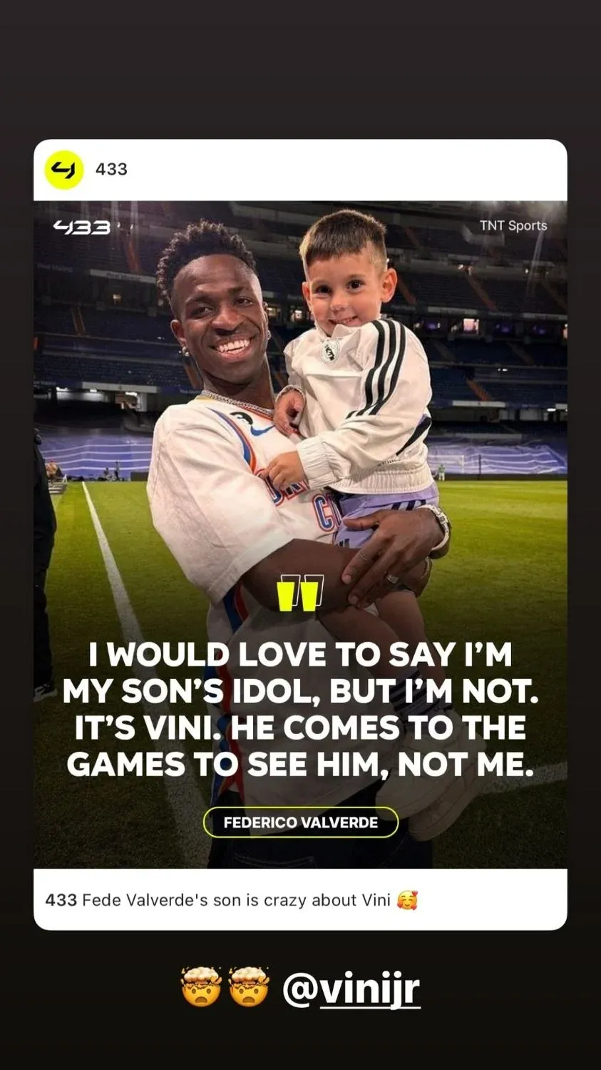 El sitio 4-3-3 en su Instagram publicó la frase de Valverde y comentó: "El hijo de Fede Valverde está loco por Vini".