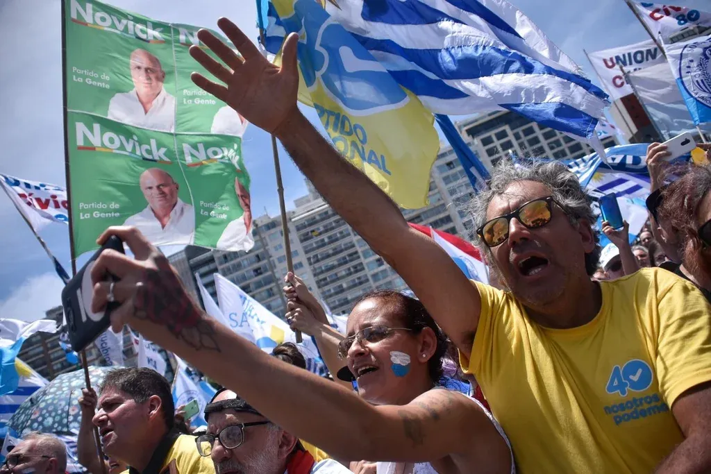 Al rato, con la coalición completa, comenzó el acto. Edgardo Novick, del Partido de la Gente, fue el primero en subir a la tarima, lo siguió Pablo Mieres, del Partido Independiente, Manini Ríos, Ernesto Talvi, del Partido Colorado, y mientras la gente empezaba a corear "presidente, presidente", subió la vicepresidenta, Beatriz Argimón, la primera mujer electa en el cargo con el voto popular, y luego, al fin, hizo su aparición Luis Lacalle Pou de la mano de su esposa Lorena "Loli" Ponce de León.