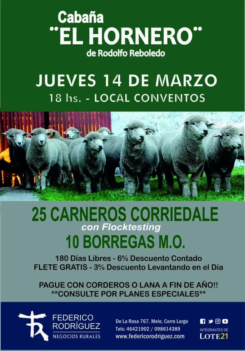 Federico Rodríguez Negocios Rurales venderá, el próximo jueves 14 de marzo, la borregada Corriedale de cabaña El Hornero, de Rodolfo Reboledo.