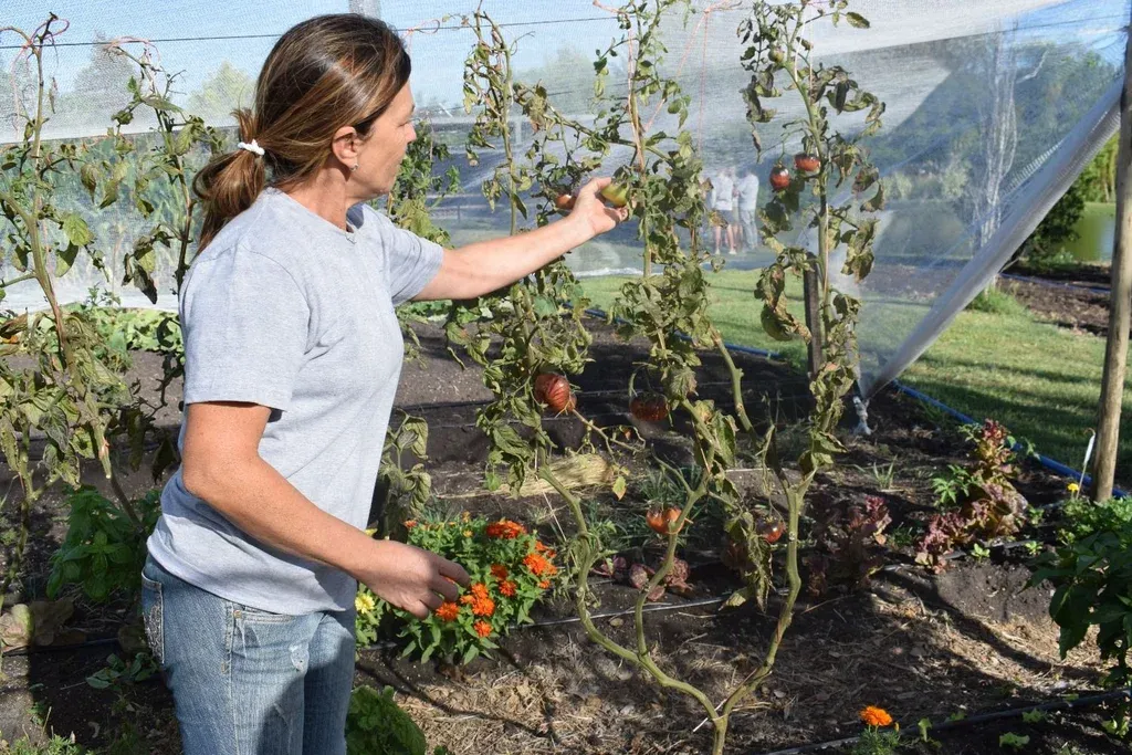 Patricia Correa en uno de los cultivos de tomates antiguos