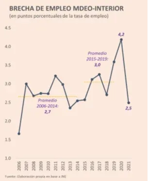 El estudio señaló que "la brecha de empleo entre ambas regiones alcanzó su menor nivel desde 2013 y se ubicó en valores históricamente bajos" y consideró que puede deberse a "el gran dinamismo que mostraron los sectores agroindustriales y su efecto derrame sobre la actividad y el empleo —típicamente más concentrado en el interior del país—".