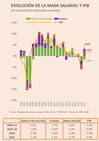 De acuerdo al CED, la masa salarial y el PIB "volvieron a presentar variaciones de igual signo lo cual denota estabilidad de la participación de las remuneraciones del trabajo en el ingreso". No obstante, a diferencia de los últimos años, el diferencial entre el crecimiento del PIB y los salarios reales estuvo alejado del crecimiento promedio del empleo.