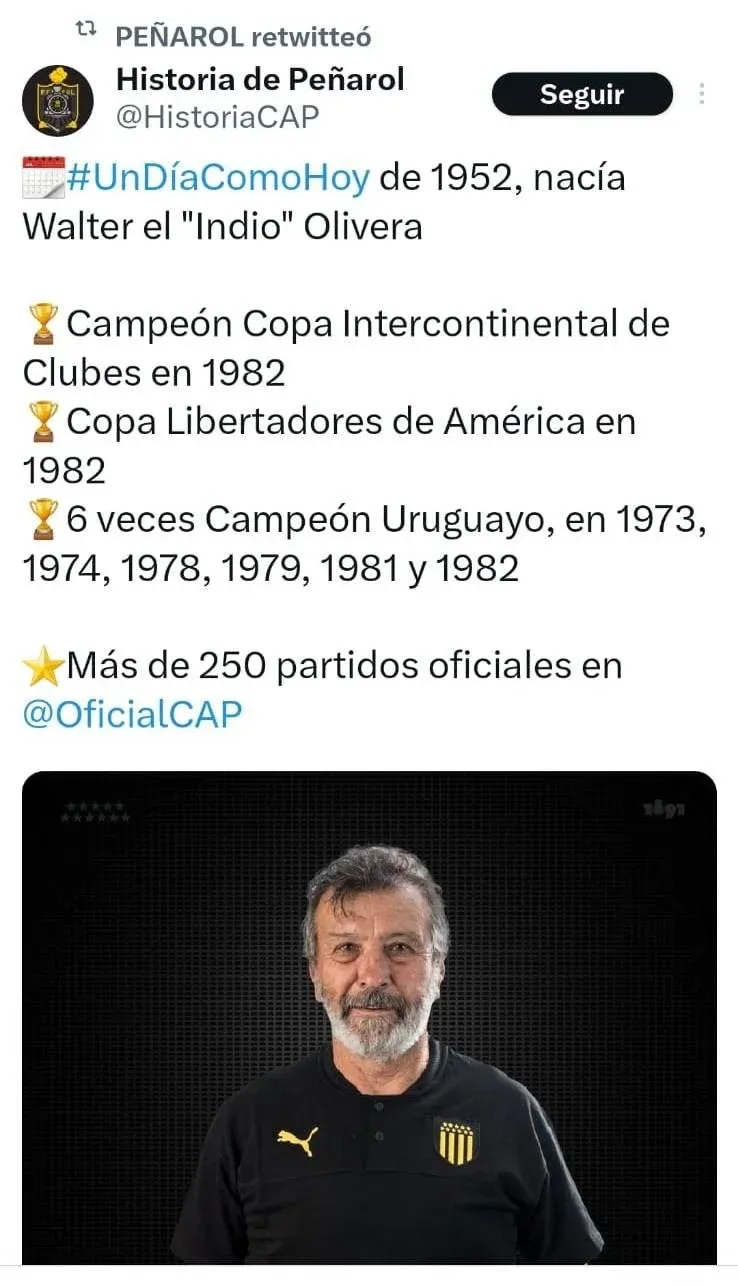 Es que Olivera fue siete veces campeón uruguayo y no seis, como publica y el propio Peñarol retuitea.