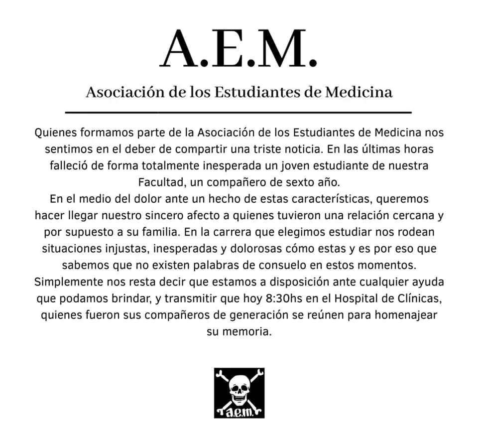 El gremio estudiantil confirmó este lunes en un comunicado que la víctima era un compañero que cursaba sexto año de la carrera y realizaba sus prácticas en el hospital de Clínicas.