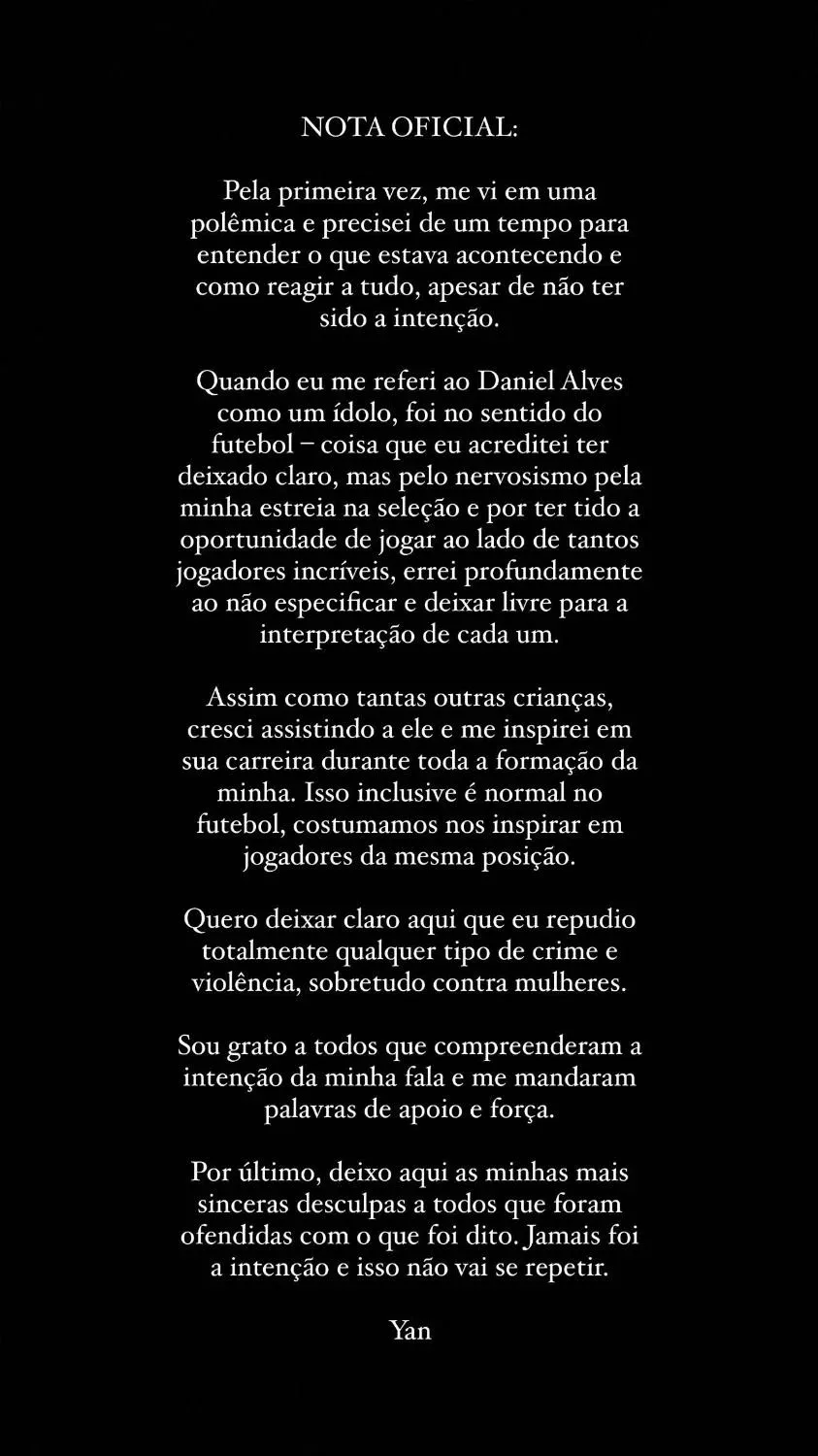 Cuando me referí a Daniel Alves como ídolo fue en el sentido futbolístico, algo que creía haber dejado claro, pero debido al nerviosismo por mi debut en la selección y por haber tenido la oportunidad de jugar al lado de tantos jugadores increíbles, Me equivoqué profundamente al no especificarlo y dejarlo libre a la interpretación de cada uno.