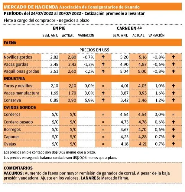 A pesar de la baja registrada desde el pico de precios de mayo hasta ahora el ganado gordo se mantiene muy por encima de un año atrás. Con un promedio en US$ 5,10 por kilo en cuarta balanza, la brecha interanual es de 15% frente a los US$ 4,40 registrados a inicios de agosto de 2021. Se han hecho negocios por encima, y por algunos lotes excepcionales, arriba de US$ 5,20.