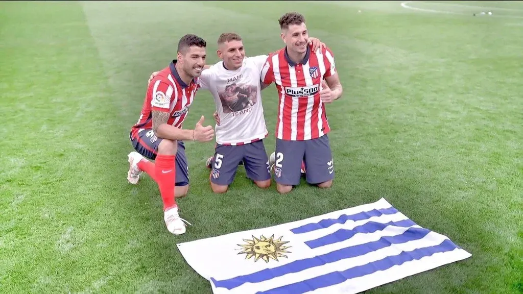 Además de Suárez, otros dos uruguayos se coronaron como integrantes del plantel rojiblanco: José María Giménez y Lucas Torreira. Al final del partido los tres compatriotas se juntaron junto a la bandera uruguaya para tomarse una fotografía.