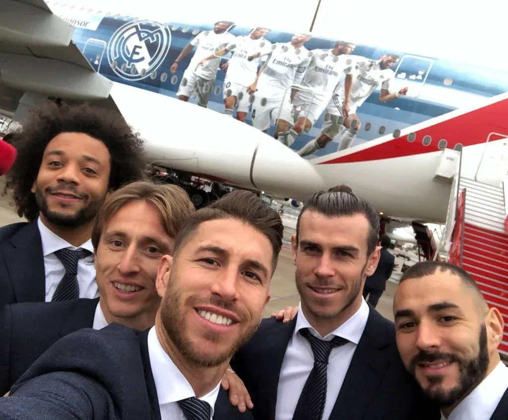 Además, Marcelo, Modric, Ramos, Bale y Benzema se hicieron un selfie en la misma posición de las imágenes que decoran el avión.
