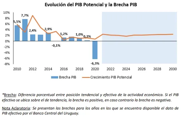 A partir de las estimaciones entregadas por el Comité de Expertos, se obtuvo la tasa de crecimiento promedio del PIB potencial para el período 2021-2030, que se ubica en 2,1%. Acá podés ver el informe completo con las proyecciones sobre otras variables vinculadas a la economía.