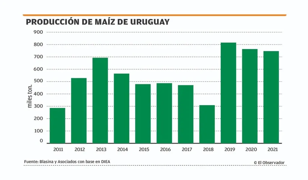 Aunque en este año habrá una baja importante en la productividad por los efectos de La Niña, fundamentalmente en los maíces de primera –que ocupan dos tercios del área–, en Uruguay la producción maicera viene creciendo en área y rendimiento.