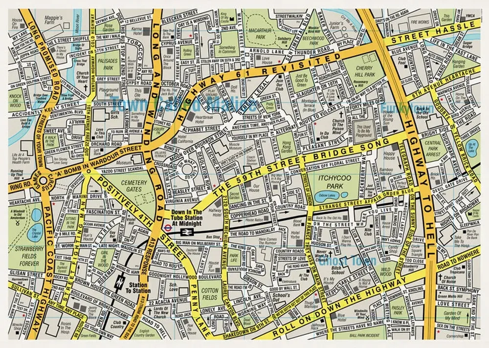 Simon & Garfunkel, Bob Dylan y The Beatles, pasando por Radiohead, Blur y Foo Fighters, para terminar con 50 Cent, Justin Timberlake y Rihanna. Cruzando géneros y décadas, una enorme variedad de títulos de canciones fueron reunidos en Songmap, un mapa que ilustra una ciudad musical ficticia con un nomenclator que vale la pena mirar en detalle.
