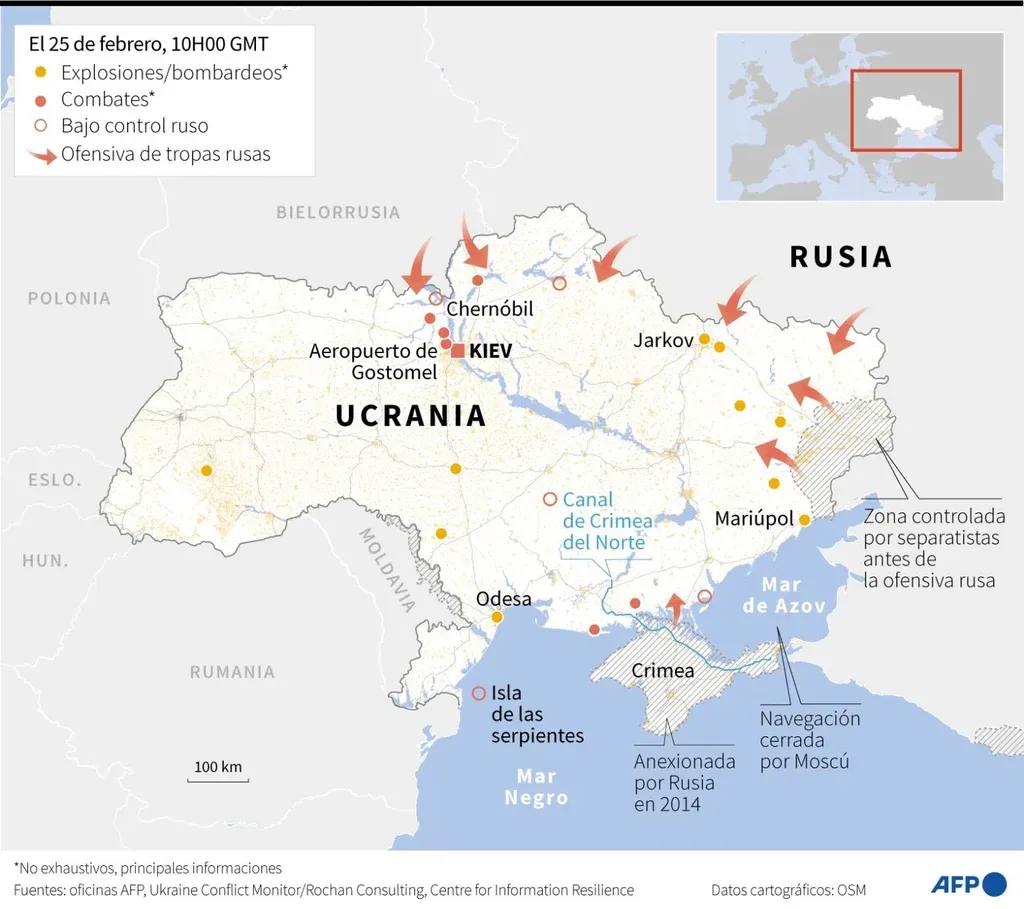 Chernóbil, la ciudad del accidente nuclear durante la Guerra Fría, ya se encuentra controlada por las tropas rusas. Se registraron ataques aéreos en varios lugares, como en Ivano-Frankivsk, Lvov, Lutsk, Kharkiv.