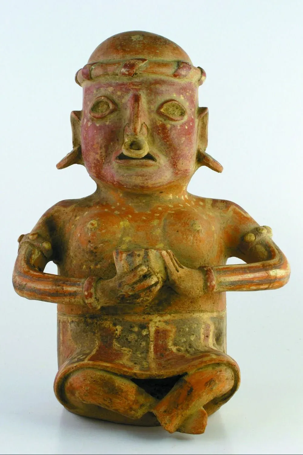 Descripción: representación de una mujer con su vestimenta y ornamentación corporal tradicional. Este tipo de figuras suele encontrarse como parte de ajuares funerarios, así como figuras de guerreros y perros.
