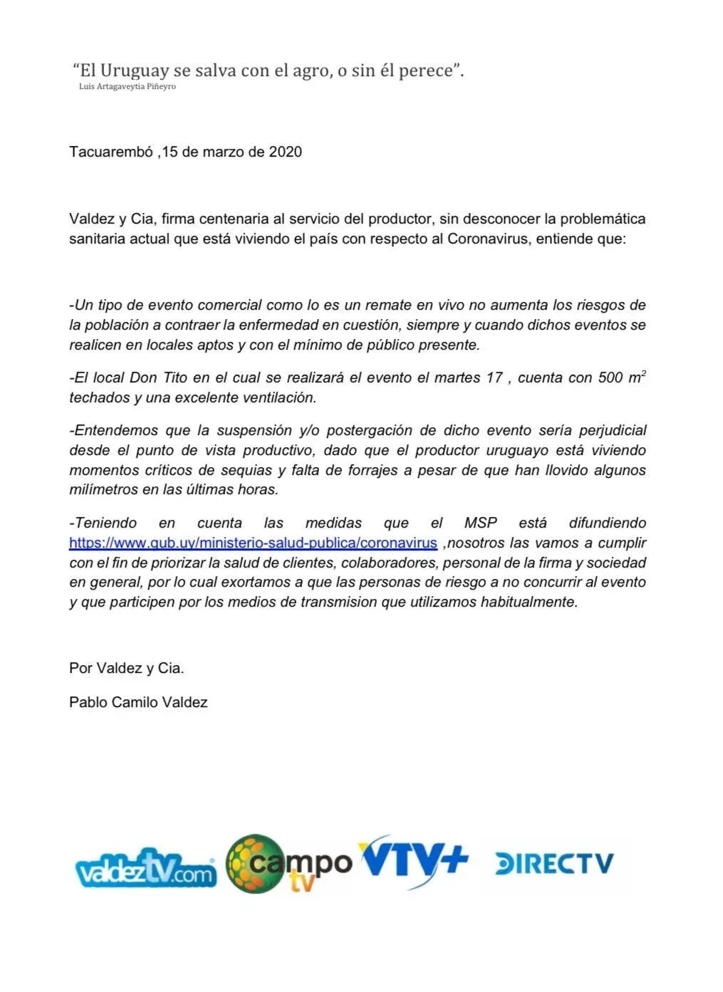 Debido a las condiciones sanitarias de público conocimiento, por la llegada del coronavirus al territorio nacional, en las últimas horas, la firma compartió un comunicado anunciando que postergar este tipo de eventos "es perjudicial" desde el punto de vista productivo, por lo que se exhortó a todos los clientes a participar de las ventas de manera virtual, a través de Valdez TV, Campo TV, VTV+ y DirecTV.