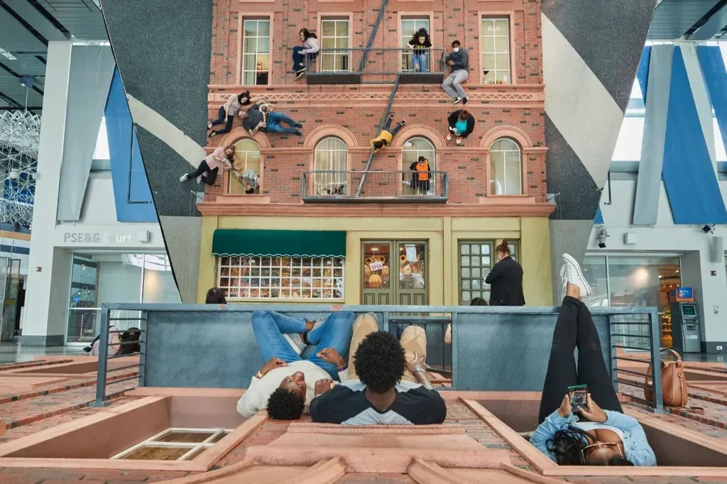 De cabeza. El mundo al revés, o tal vez el mundo desde diferentes perspectivas, es la experiencia que se puede vivir en esta muestra-instalación en Nueva York, pero que para ahorrarte el viaje te muestro acá. Forma parte de la serie Bâtiment de Leandro Erlich y parece desafiar la gravedad con una fachada que juega con la ilusión óptica.