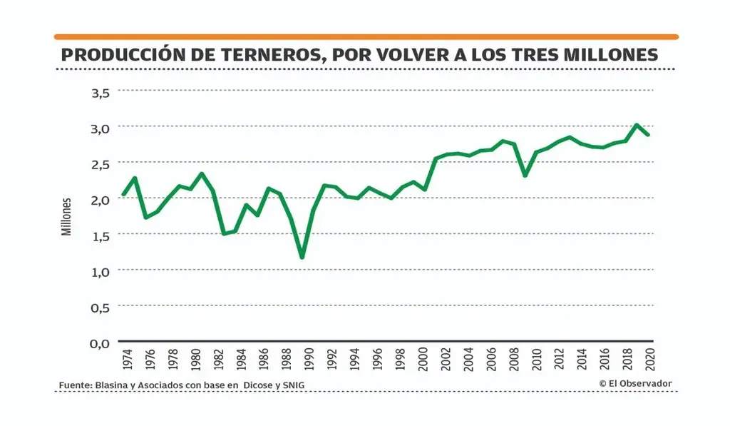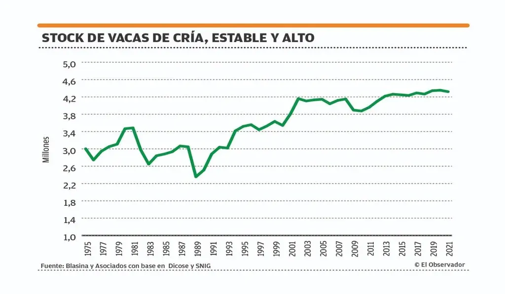 EO El stock de vacas se mantiene muy estable. Aumentar la producción de terneros solo es posible a través de mejorar la eficiencia reproductiva, que se ha mantenido casi fija en torno al 66% de terneros destetados. Tres años atrás un verano muy llovedor llevó, sin embargo, a un aumento a 70% que se tradujo en una producción récord de terneros, que logró superar los tres millones de animales destetados por única vez en la historia de Uruguay.