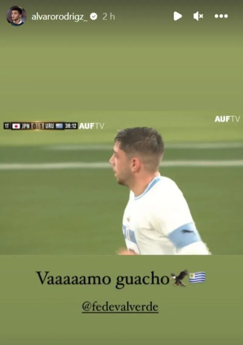 En una historia de Instagram, envió un saludo y un elogio a su compañero Federico Valverde por su golazo ante los japoneses para el transitorio 1-0.