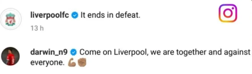 Y Darwin contestó: "‘Come on Liverpool, we are together and against everyone. ✊" (“Vamos Liverpool, estamos juntos y contra todos. ✊").