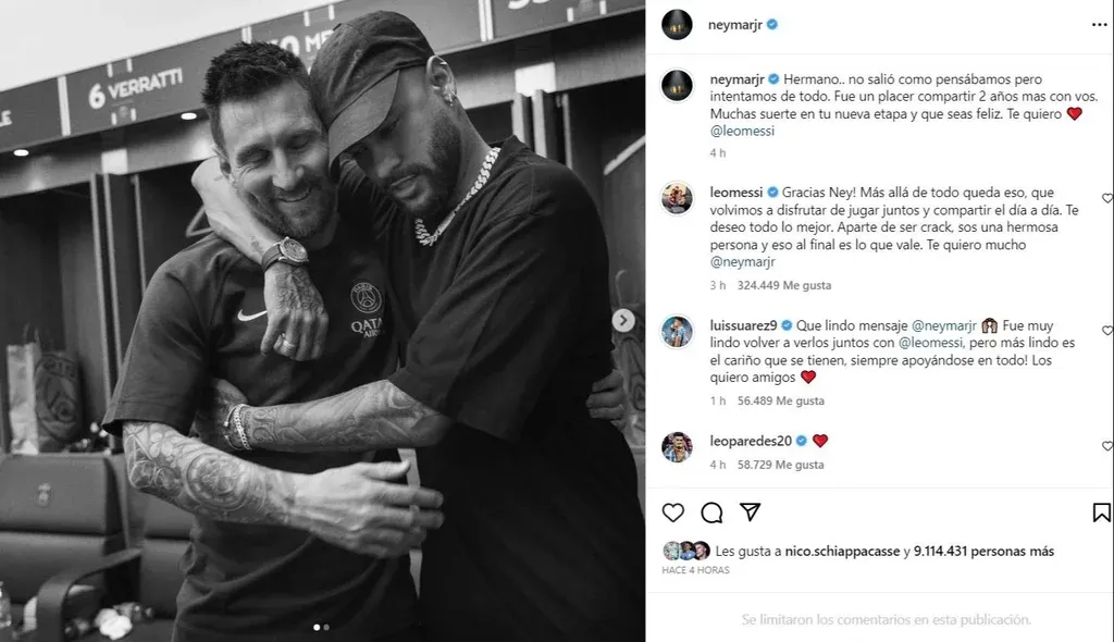 En ese contexto, su compañero de ofensiva que se encuentra lesionado, Neymar, quien ya jugara junto a él con mucho mayor suceso en Barcelona -allí sí, ganando todo- le escribió un texto de despedida en su cuenta de Instagram.