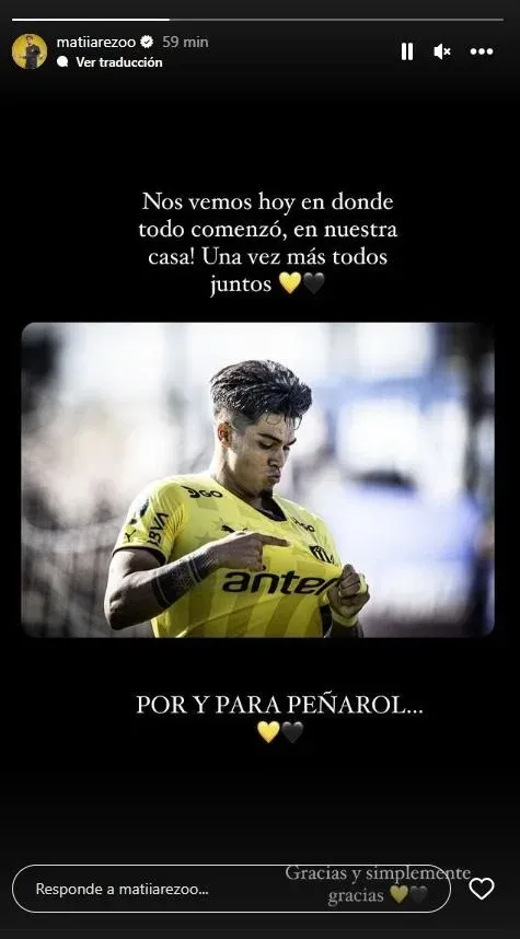 "Nos vemos hoy en donde todo comenzó, en nuestra casa. Una vez más todos juntos. Por y para Peñarol. Gracias y simplemente gracias", escribió Arezo.