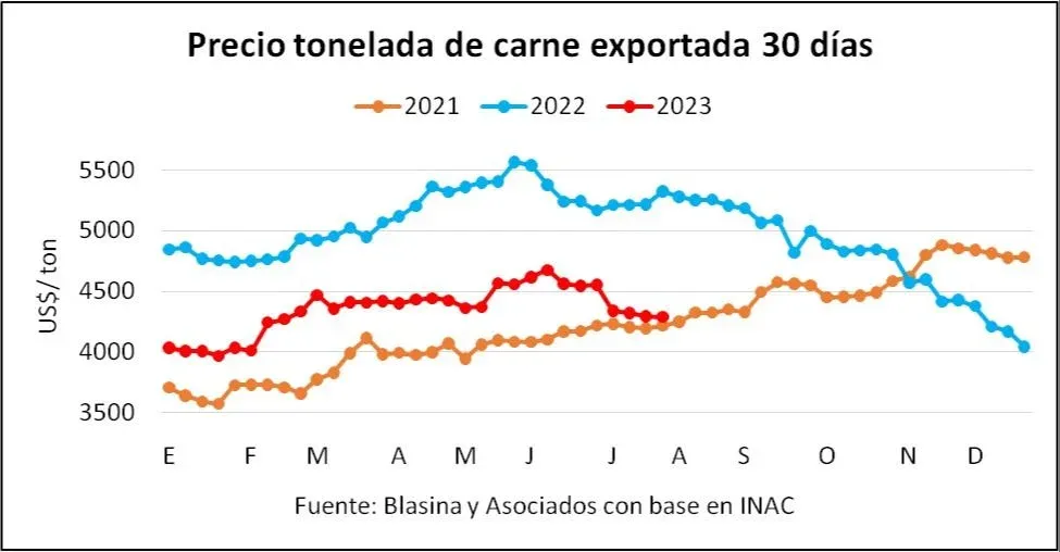 Mercado ganadero El precio de exportación para la carne vacuna cayó a US$ 4.118 por tonelada la semana pasada y el promedio de los últimos 30 días móviles fue el más bajo desde mediados de febrero: US$ 4.290 por tonelada, de acuerdo a los datos preliminares del Instituto Nacional de Carnes (INAC).