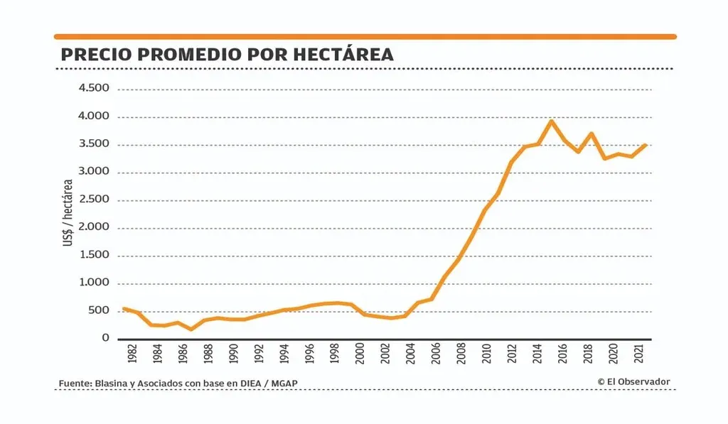 El precio medio anual de la hectárea aumentó ininterrumpidamente desde 2003 a 2014 –récord de US$ 3.934 que se mantiene– para luego generar leves fluctuaciones tanto a la baja como al alza hasta el presente, indica la Oficina de Estadísticas Agropecuarias (DIEA) del MGAP.