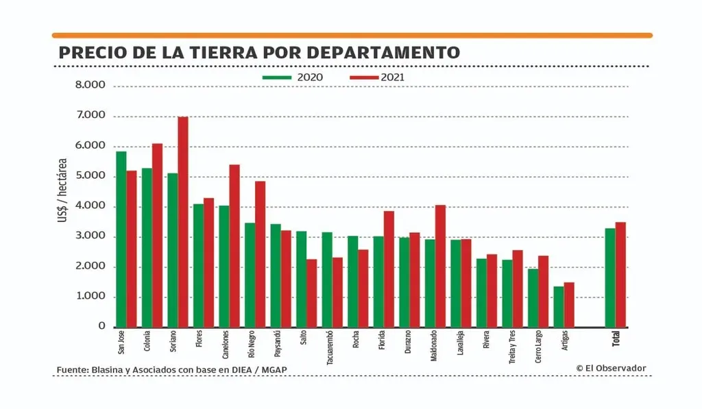 El promedio por hectárea aumentó 25% en 2021 respecto al año anterior, según los datos del MGAP.