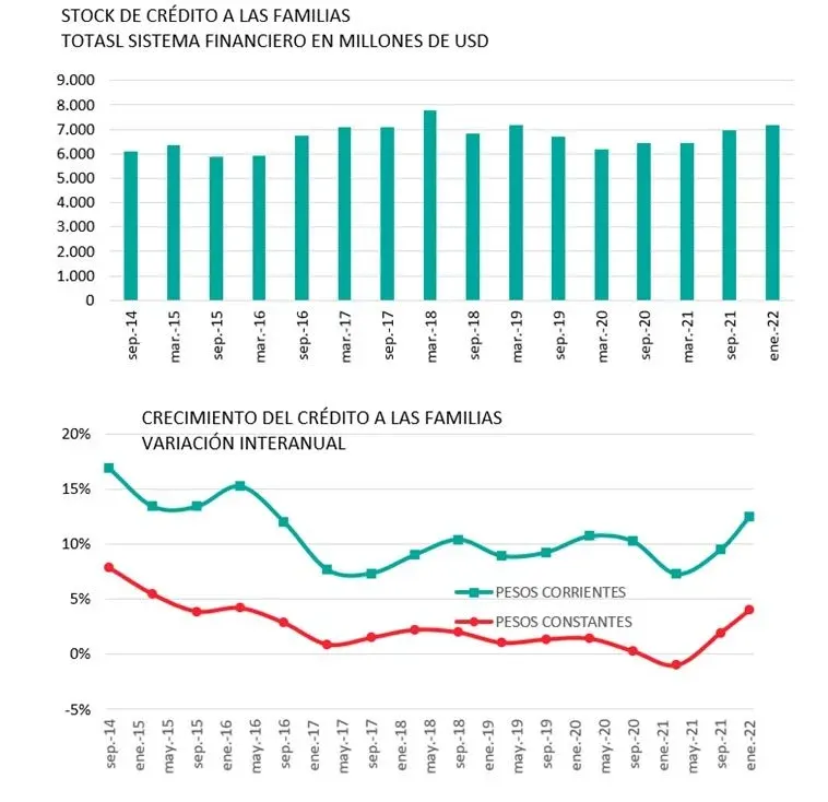 El mercado de créditos al consumo abrió el año 2022 con un crecimiento real de 4% respecto a un año atrás, y con una recuperación de los últimos meses, que no ha sido sostenida, sino que ha tenido oscilaciones, sostiene el Monitor del Mercado de Crédito al Consumo de la firma Pronto! divulgado este lunes. El stock de crédito a las familias superó los US$ 7 mil millones en diciembre y está creciendo apuntalado por un fuerte incremento en los créditos no hipotecarios, destaca.