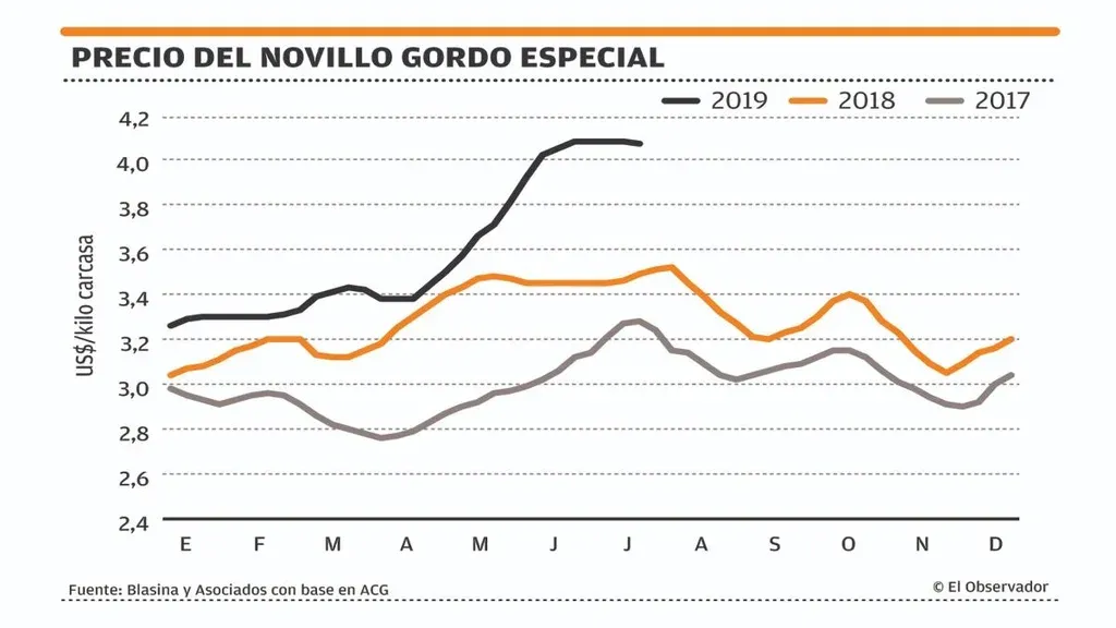 En el caso de la vaca gorda hay un abanico de precios más amplio por tipo de ganado, precio y calidad, que va desde un piso de US$ 3,70 hasta un máximo de US$ 3,85. Y para vaquillona hay precios de punta de US$ 3,95 a US$ 4.