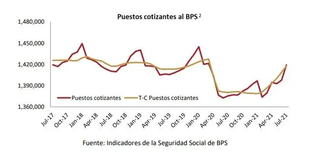 En julio la cantidad de puestos cotizantes al Banco de Previsión Social (BPS) fue de 1.419.186; 3,2% mayor a julio de 2020, según datos publicados por el Observatorio de Seguridad Social del Centro de Investigaciones Económicas (Cinve).
