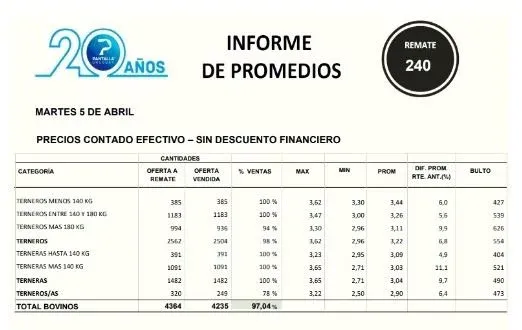 Valeria Sasso, gerente comercial de Pantalla Uruguay, comentó a El Observador que en esta oportunidad “el mercado respondió a excelentes ganados, con precios que lo demuestran”. Según detalló, en la jornada se vio mucha demanda y agilidad en los negocios.