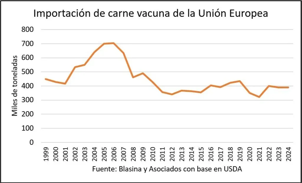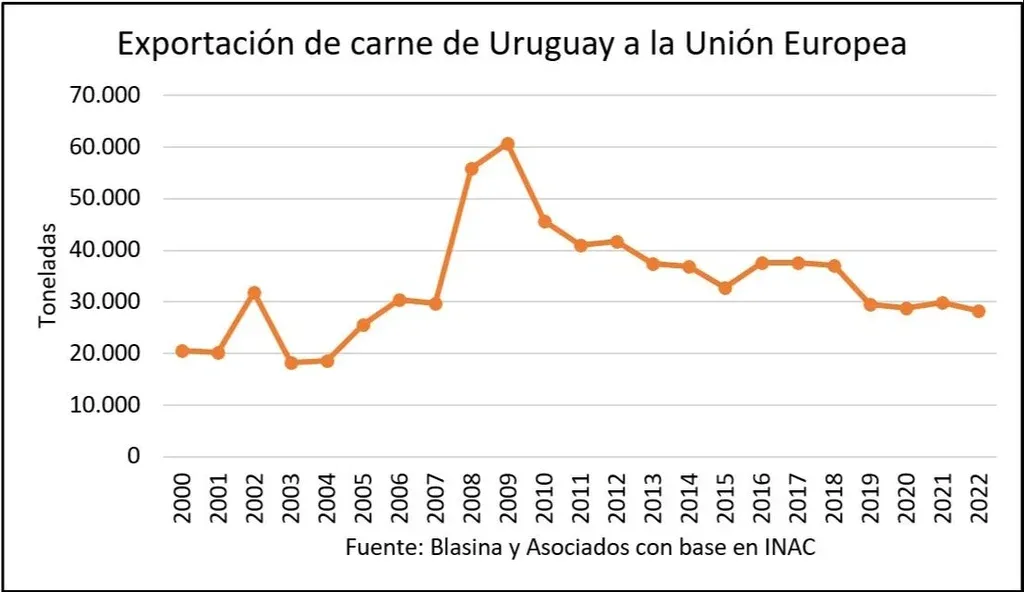 La Unión Europea es el tercer mercado para la carne uruguaya y el que paga los mejores precios. En sus mejores años, con exportaciones de 55 mil y 60 mil toneladas anuales, Uruguay representó el 12% de las importaciones del bloque.