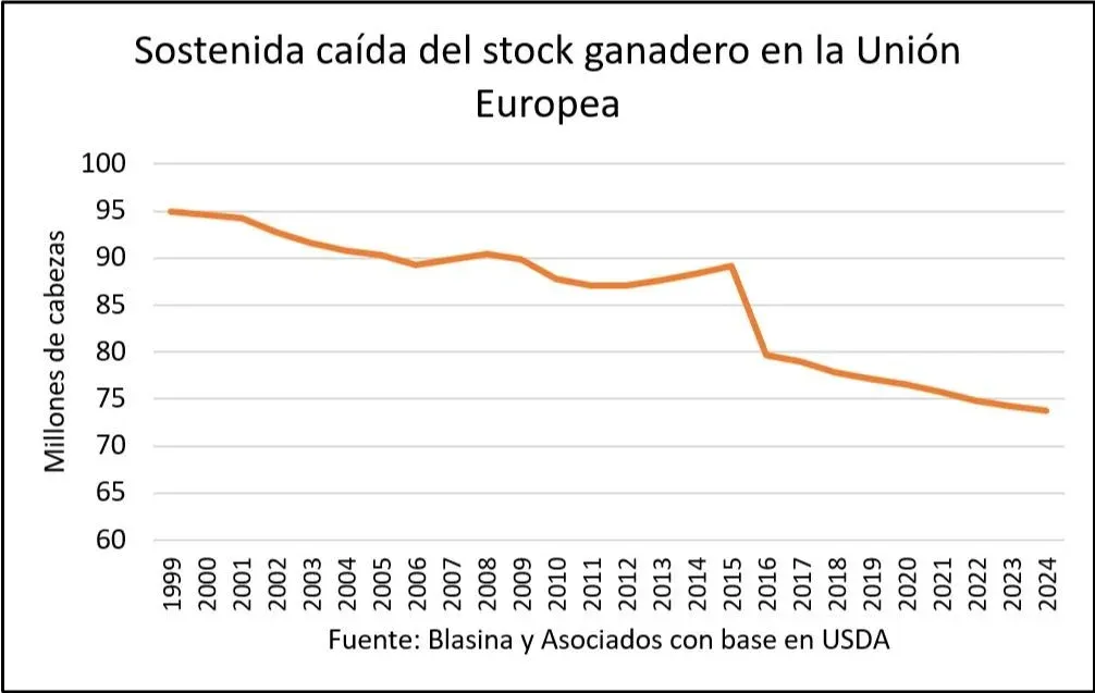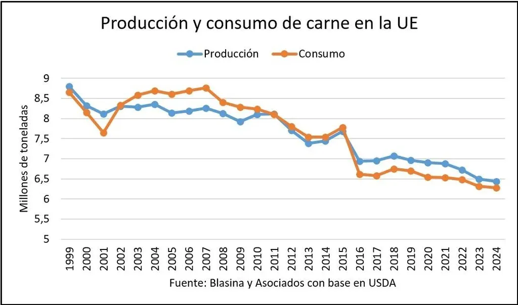 El consumo de carne en los países europeos creció hasta el año 2007, cuando llegó a un pico de 8,7 millones de toneladas anuales y comenzó a bajar sostenidamente hasta algo más de 6 millones de toneladas en los últimos cinco años. Y sigue en descenso.