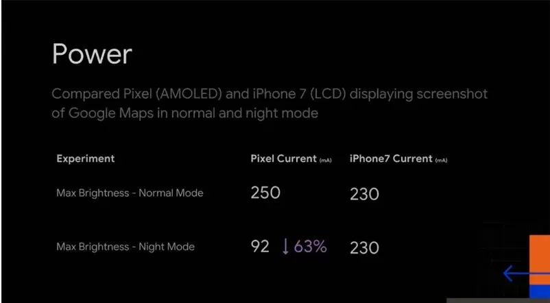 Google hizo una serie de pruebas entre un Pixel (con pantalla OLED, al igual que el Galaxy S o los Note de Samsung y los iPhone X, XS y XS Max) y un iPhone 7 (con pantalla LCD). Al cambiar la interfaz de Google Maps al modo noche, la batería del Pixel empezó a consumir un 63% menos de corriente, mientras que la del iPhone no varió su consumo en absoluto.