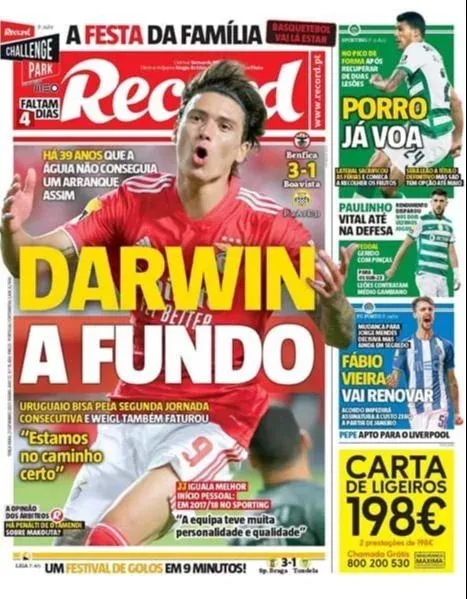 Darwin Núñez volvió con todo después de una intervención en la rodilla que lo alejó cuatro meses de las canchas. En los últimos dos partidos de Benfica, marcó cuatro goles. Dos a Santa Clara y este lunes dos a Boa Vista.