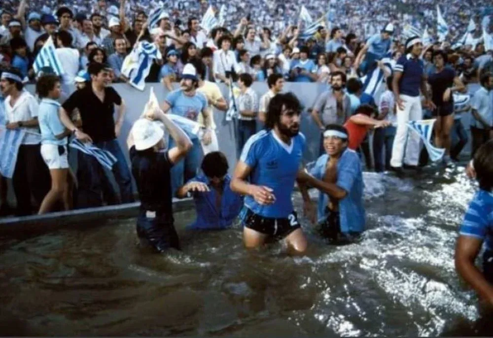 El Indio Olivera rodeado de los hinchas uruguayos en el foso nuevito en aquella época, cuando terminaba de ganar el Mundialito con Uruguay