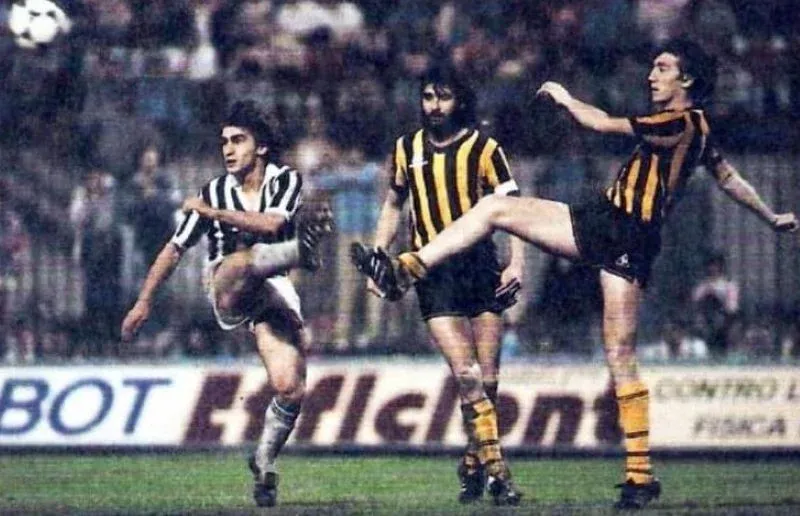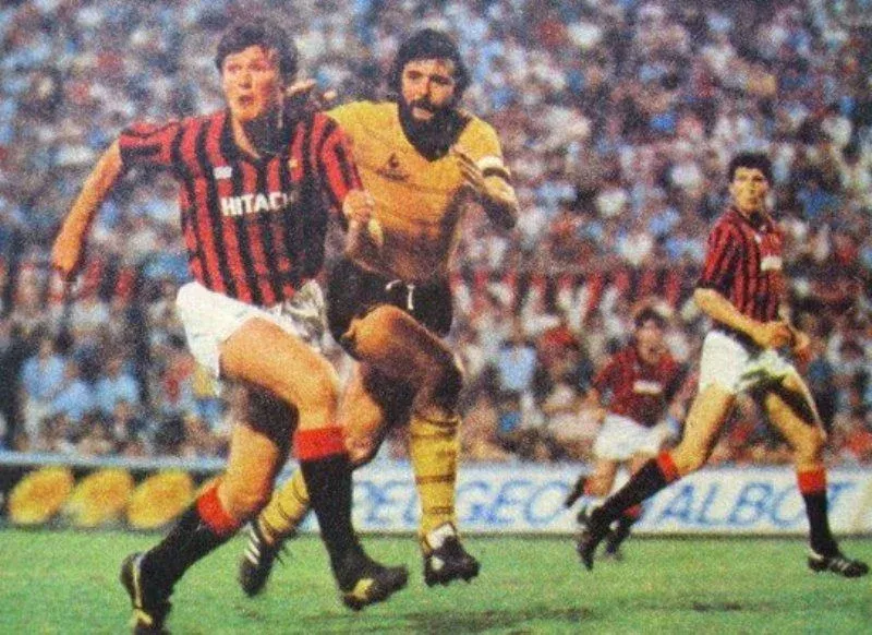 Walter Olivera marcando a un delantero de Milan en la Supercopa de Campeones jugada en el Estadio San Siro de Italia en junio de 1981