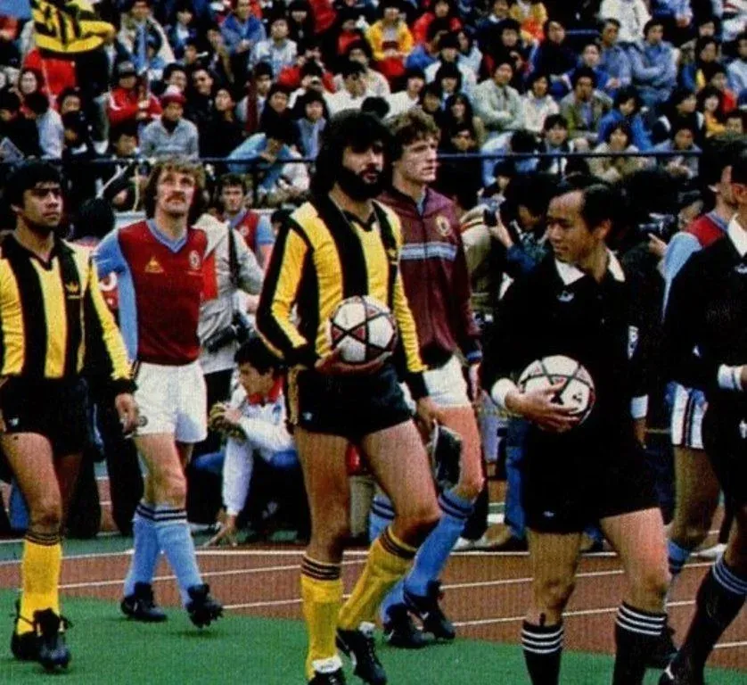 Walter Olivera encabeza la salida del equipo de Peñarol en Tokio previo a enfrentar a Aston Villa de Inglaterra por la final de la Copa Intercontinental 1982; detrás suyo viene Juan Vicente Morales