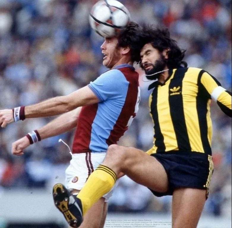 El Indio Olivera, de Peñarol, va con todo arriba ante Peter Withe, uno de los delanteros de Aston Villa