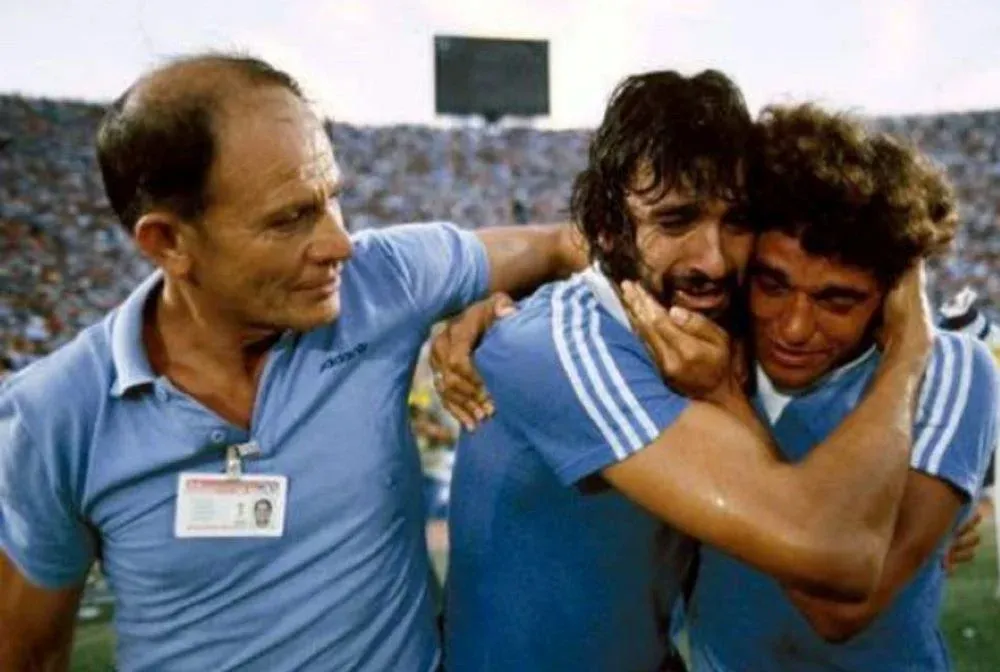 El Indio Walter Olivera llora emocionado junto a Nelson Marcenaro luego de haber ganado la Copa de Oro con Uruguay en 1981