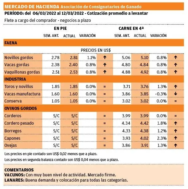 El mercado de lanares muestra flechas verdes en todas las categorías. El cordero pesado cotiza sobre US$ 4,42 por kilo, los borregos están en US$ 4,38, capones en US$ 4,02 y ovejas en US$ 3,91. La demanda es sostenida y hay buena colocación.