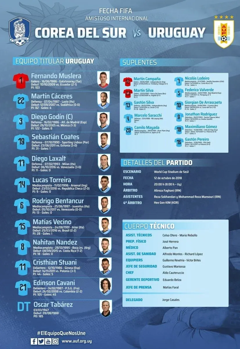 Los celestes formaron con Fernando Muslera, Martín Cáceres, Diego Godín, Sebastián Coates, Diego Laxalt, Lucas Torreira, Rodrigo Bentancur, Matías Vecino, Nahitan Nández, Cristhian Stuani y Edinson Cavani.