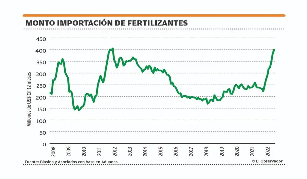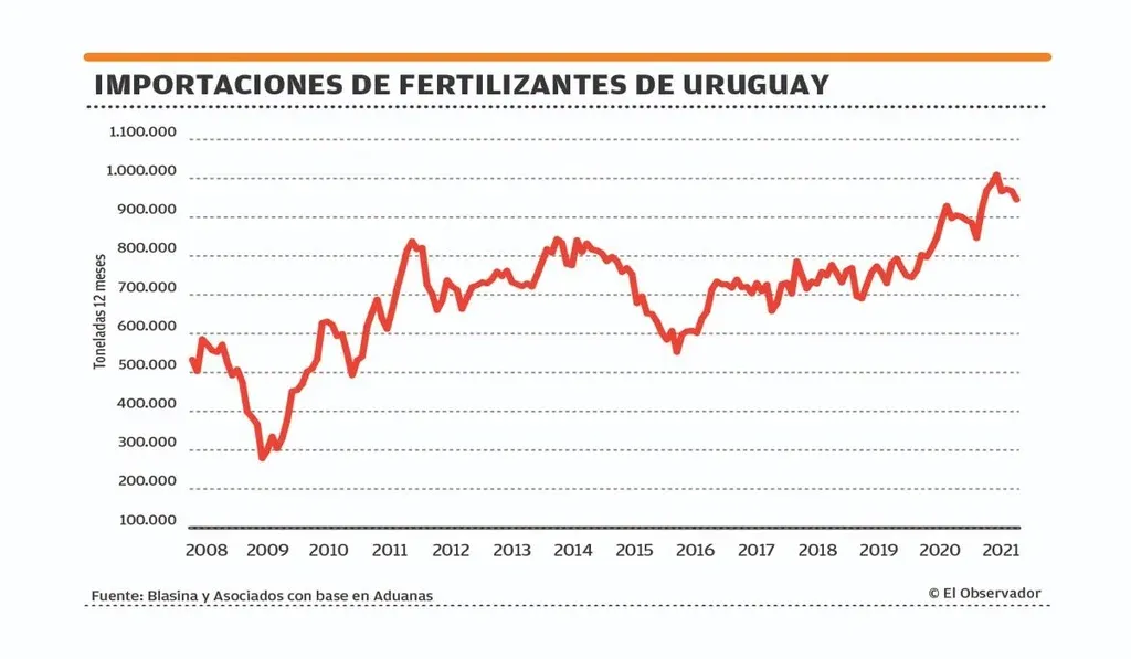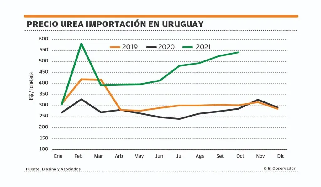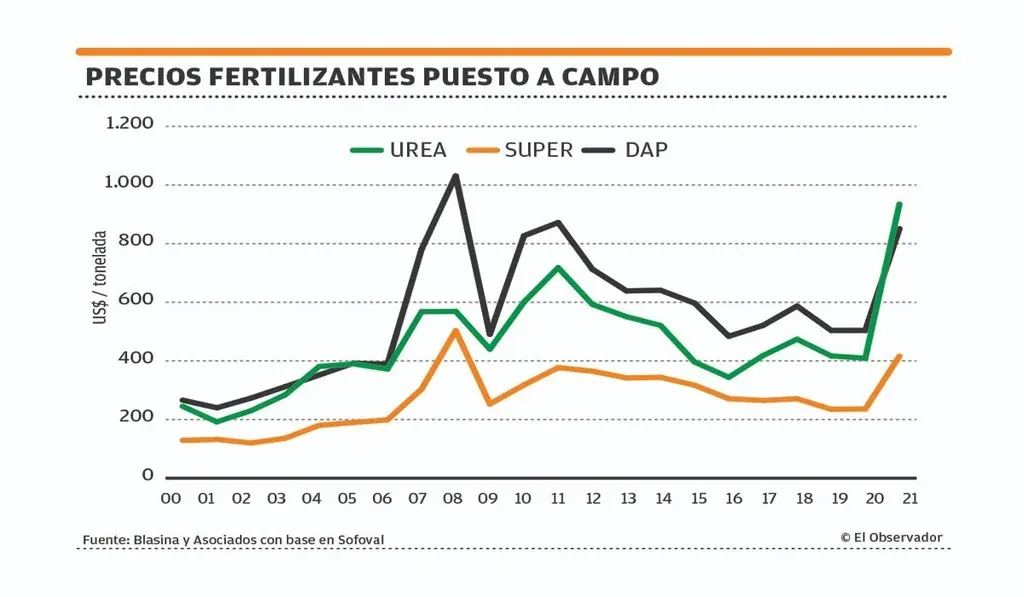 EO El jefe de Agroinsumos de la Sociedad de Fomento Rural de Colonia Valdense (Sofoval), Carlos Ramírez, lo muestra en una gráfica de valores previstos a diciembre 2021 puesto en campo: la urea saltó de US$ 400 a US$ 935 la tonelada; el fosfato diamónico de menos de US$ 500 a US$ 841 la tonelada; y el superfosfato de US$ 230 a US$ 400 la tonelada.