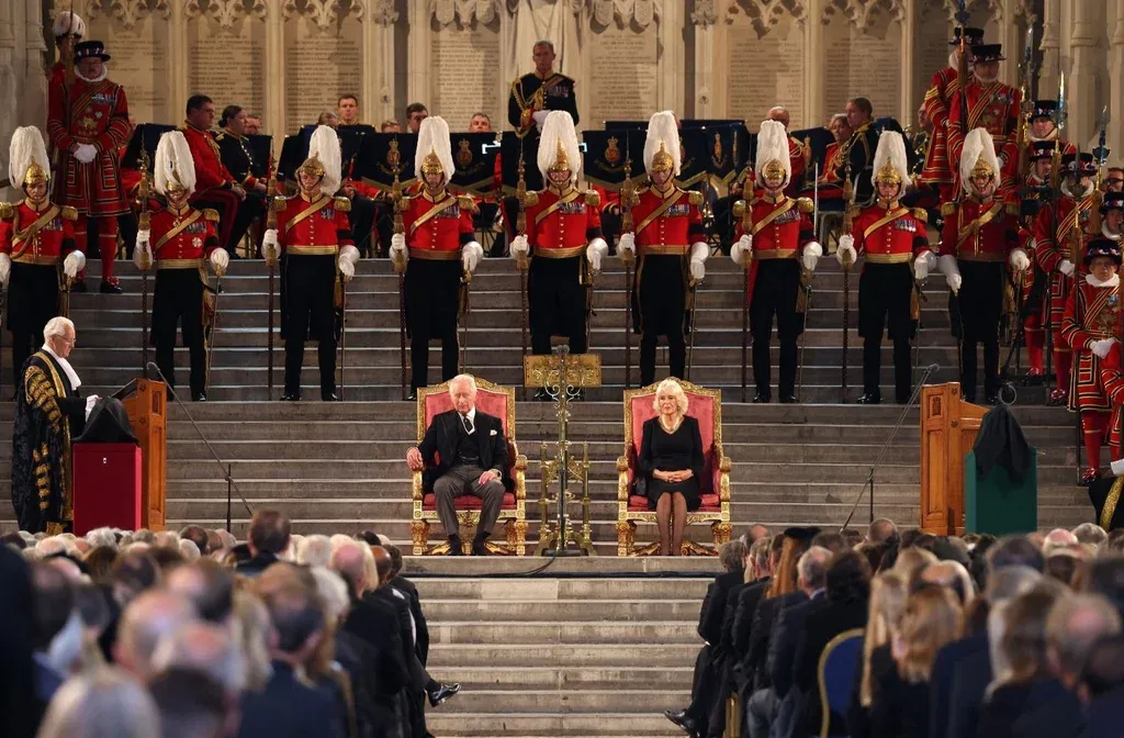 El rey Carlos III de Gran Bretaña y la reina consorte Camilla de Gran Bretaña asisten a la presentación de discursos de ambas cámaras del Parlamento en Westminster Hall, dentro del Palacio de Westminster, en el centro de Londres el 12 de setiembre de 2022.